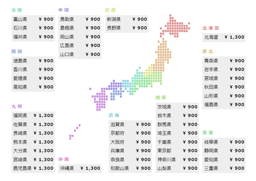 改定後:北海道・沖縄・九州一律1,300円、その他の地域一律900円。ご注文合計金額7,000円以上で送料無料。
